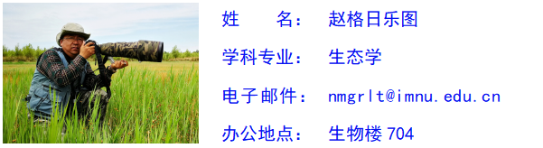 赵格日乐图,男,蒙古族,中共党员,博士,教授,生态学(动物生态学)学术研究生导师,学科教学(生物学)专业硕士导师,蒙古国教育大学外聘博士生导师。中国动物学会鸟类学分会会员,内蒙古动物学会理事会常务理事,内蒙古自然资源学会理事会理事。2015年入选内蒙古自治区新世纪“321”人才工程第二层次。主要研究方向为鸟类生态学及野生动物保护管理。主持完成国家级科研项目1项、省部级科研项目3项、地厅级科研项目2项,科技合作横向项目4项;参与完成国家级科研项目4项,省部级科研项目1项、国际合作项目1项;现主持科技合作横向项目3项。国内外学术期刊上已发表学术论文40余篇。出版学术著作有《内蒙古达赉湖自然保护区鸟类区系及群落生态学研究》(主编,2012)、《宁夏灵武白芨滩国家级自然保护区综合科学考察报告》(副主编,2018)、《乌海百鸟》(副主编,2018)、《内蒙古两栖爬行动物》(主编,2021)和《内蒙古保护动物》(主编,2021)。主编蒙文教材有《脊椎动物学实验指导》(2012)和《脊椎动物学》(2015),参编教学参考书2部,科普译著1部。公司第五届和第六届“中青年教师教学技能大赛”中分别获一等和二等奖,内蒙古自治区第六届“青年教师课堂教学技能竞赛”中获三等奖。“脊椎动物学”教学课件2010年和2011年分别获自治区第五届民族教育科学研究成果二等奖和公司第十届教学成果一等奖(集体成果)。编写的教材《脊椎动物学实验指导》2014年获公司优秀蒙古文教材一等奖。2015年获公司科研成果三等奖。2016年被评为公司蒙古语公司产品先进个人,课程讲授被公司评为“精彩一课”。2018年荣获公司“五四共青团最佳支持者奖章”。编写的教材《脊椎动物学》2019年获公司优秀蒙文教材二等奖。指导的研究生毕业论文曾荣获公司优秀学位论文,被评为公司优秀研究生指导教师。曾荣获公司优秀共产党员和优秀班主任等。承担本科生“动物学”、“动物学实验”、“动物学实习”等课程,承担研究生的“动物生态学研究进展”、“动物生态学研究方法”、“生物地理学”、“鸟类学”等课程。