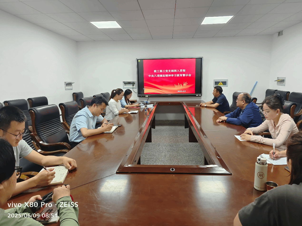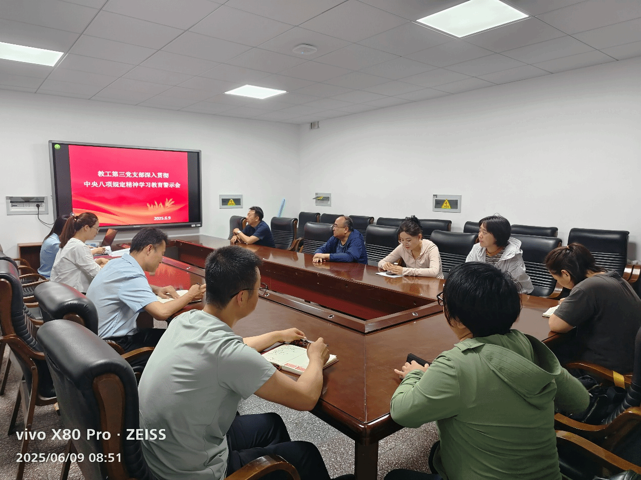 为深入贯彻落实习近平总书记关于加强党的作风建设的重要论述和中央八项规定及其实施细则精神,推动全面从严治党向纵深发展。6月9日上午,教工第三党支部召开深入贯彻中央八项规定精神学习教育警示会。支部书记吴艳玲主持会议,支部全体党员参加。