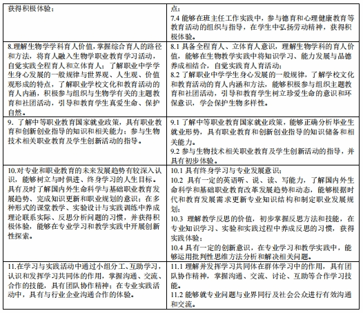 目标4:熟悉生物技术发展趋势,具有产业发展转型意识,树立终身学习理念,进行学习和专业发展规划;具有国际视野,了解国外生物学职业教育改革发展的趋势和动态,能够借鉴国际先进教育理念进行公司产品或技术研发;掌握反思方法和技能,具有一定的创新意识,能够运用批判性思维方法分析和解决职业公司产品问题;理解学习共同体的作用,具有团队协作精神,掌握沟通合作技能,开展合作教研,持续提升教学能力和水平。