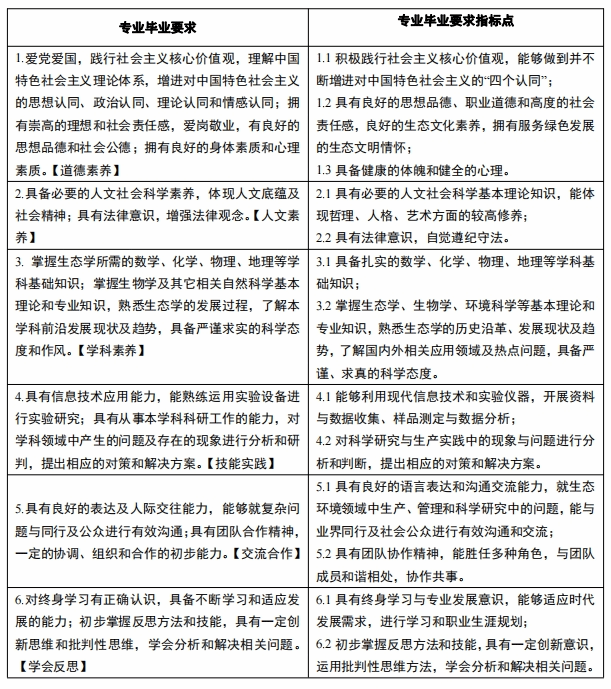 目标3:树立终身学习理念,熟悉专业发展核心内容,制订专业学习与职业发展规划;具有创新意识、批判性思维和可持续发展理念,具有适应社会需求、继续深造的潜能;具有国际视野,了解国外生态学发展动态,提升服务于国家生态文明建设的能力。