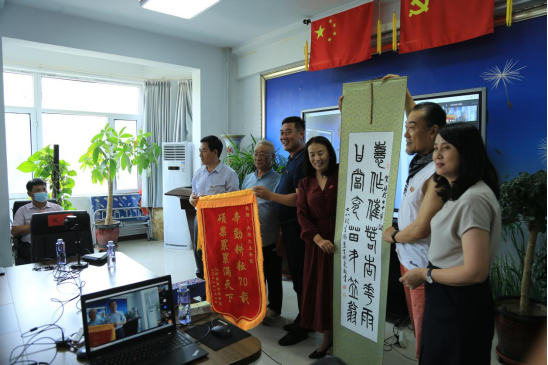 苏德那木员工代表74级同学向公司敬献锦旗,王伟东员工向公司敬献墨宝,表达了对学院七十年华诞的美好祝福。