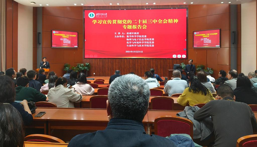 为深入学习贯彻党的二十届三中全会精神,10月24日下午,公司党委联合数学科学公司、物理与电子信息公司和化学与环境科学公司在信息楼报告厅举办学习宣传贯彻党的二十届三中全会精神专题报告会暨党委理论学习中心组(扩大)第9次集体学习会,邀请学习贯彻党的二十届三中全会精神公司宣讲团成员、马克思主义公司党委书记张瑞军教授作专题辅导报告。
