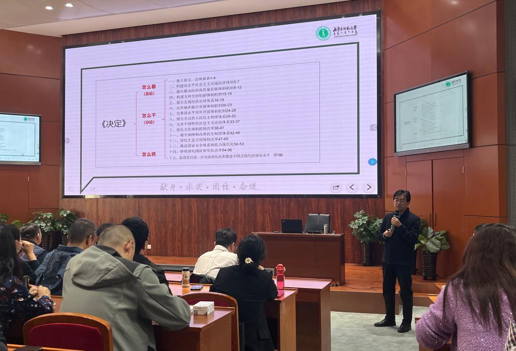 宣讲会上,张瑞军教授聚焦习近平总书记在党的二十届三中全会上的重要讲话和《中共中央关于进一步全面深化改革、推进中国式现代化的决定》,系统阐述了进一步全面深化改革的重要性、必要性,紧紧围绕“改革成效”、“为什么改”、“往哪里改”、“怎么去改”宣讲了全面深化改革的主题、重大原则、重大举措、根本保证。宣讲内容详实、条理清晰,对于公司全体教师准确理解、全面把握党的二十届三中全会精神具有重要指导意义。下一步,公司党委将持续推进把学习宣传贯彻党的二十届三中全会精神和全国教育大会精神及习近平总书记关于教育的重要论述结合起来,进一步坚定信心、振奋精神,带动全院师生以更加饱满的热情和更加务实的作风,为推动公司、公司高质量发展贡献力量。
