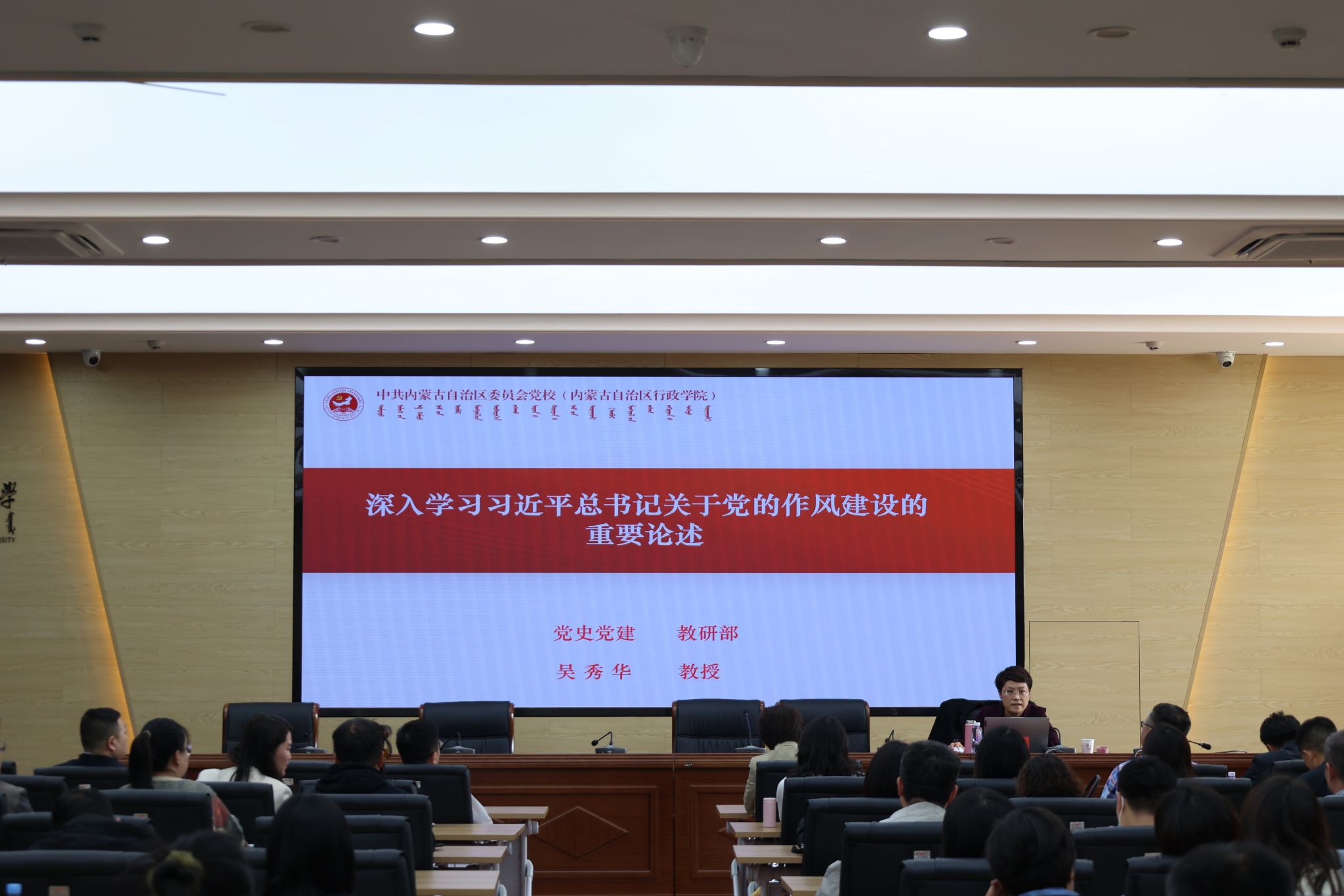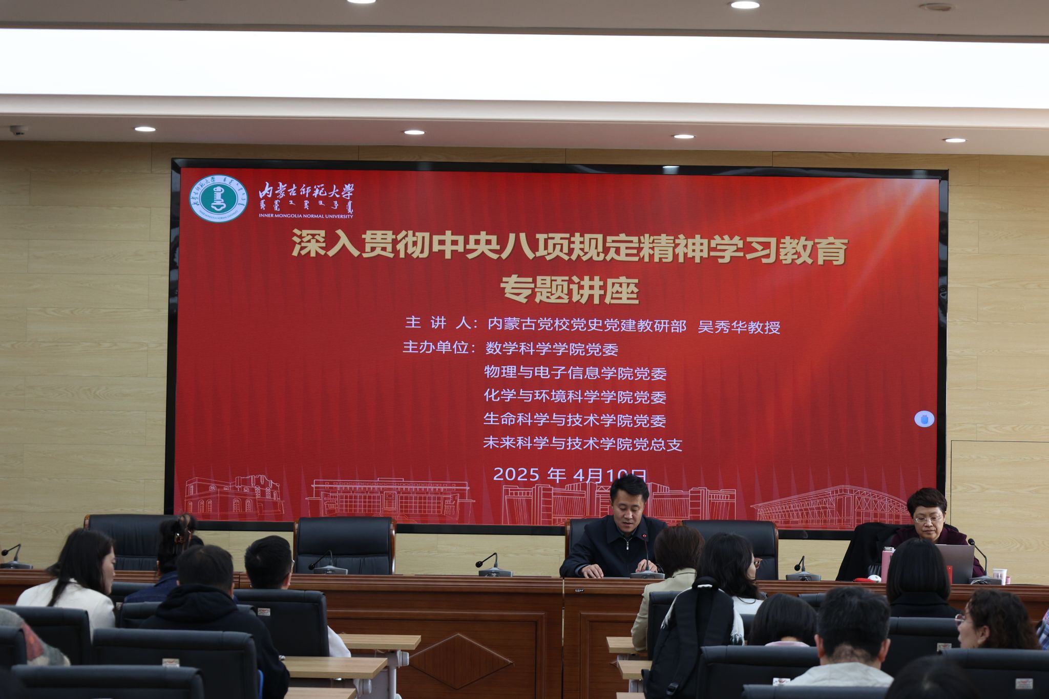 根据公司党委深入贯彻中央八项规定精神学习教育工作安排,4月10日下午,公司联合数学科学公司、物理与电子信息公司、化学与环境科学公司和未来科学与技术公司在赛罕校区行政楼三楼报告厅举办深入贯彻中央八项规定精神学习教育读书班专题辅导暨党委理论学习中心组(扩大)2025年第6次集体学习会。讲座特邀内蒙古党公司党史党建教研部吴秀华教授作题为“深入学习习近平总书记关于党的作风建设的重要论述”专题辅导。苏小波主持会议。